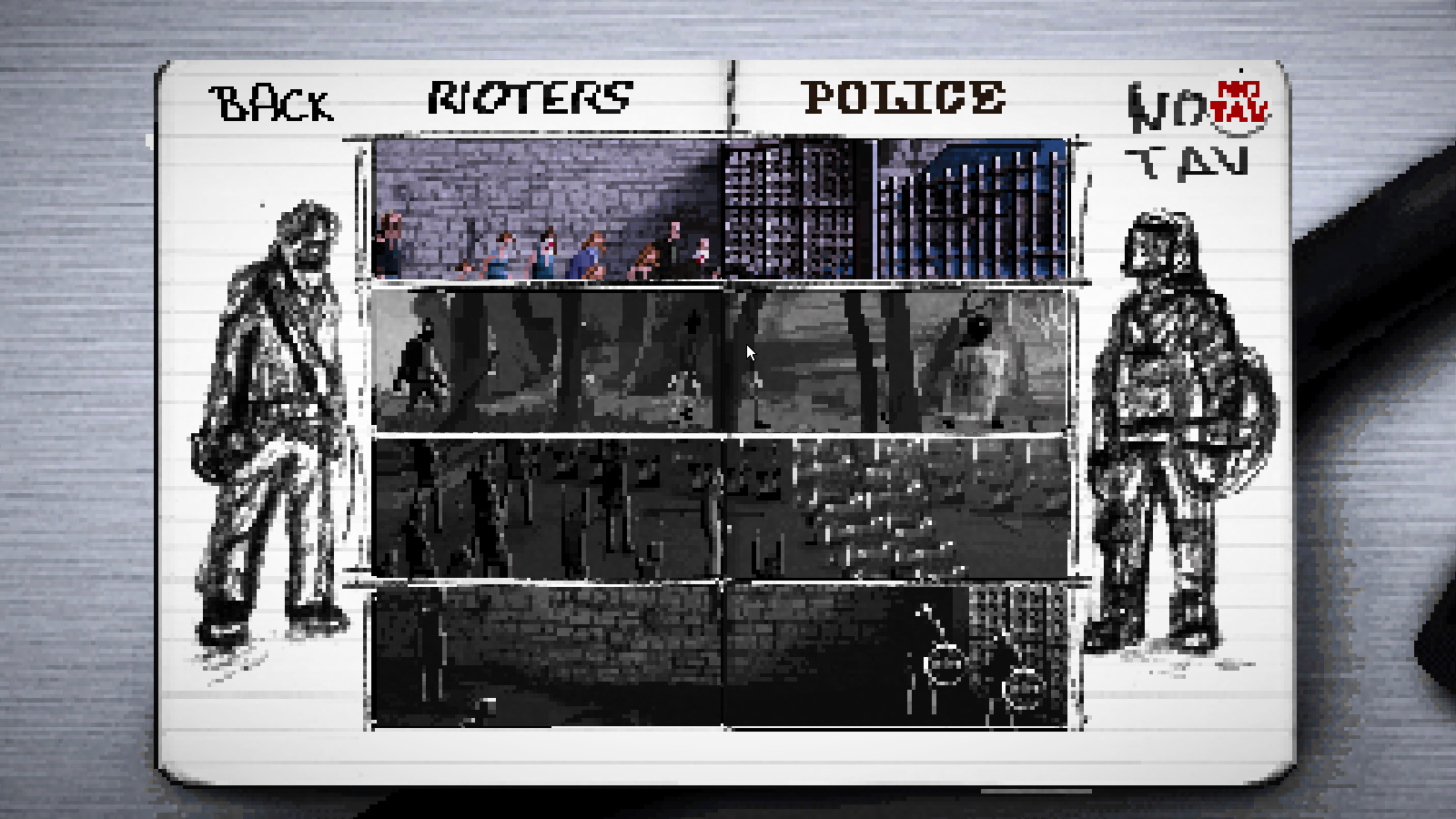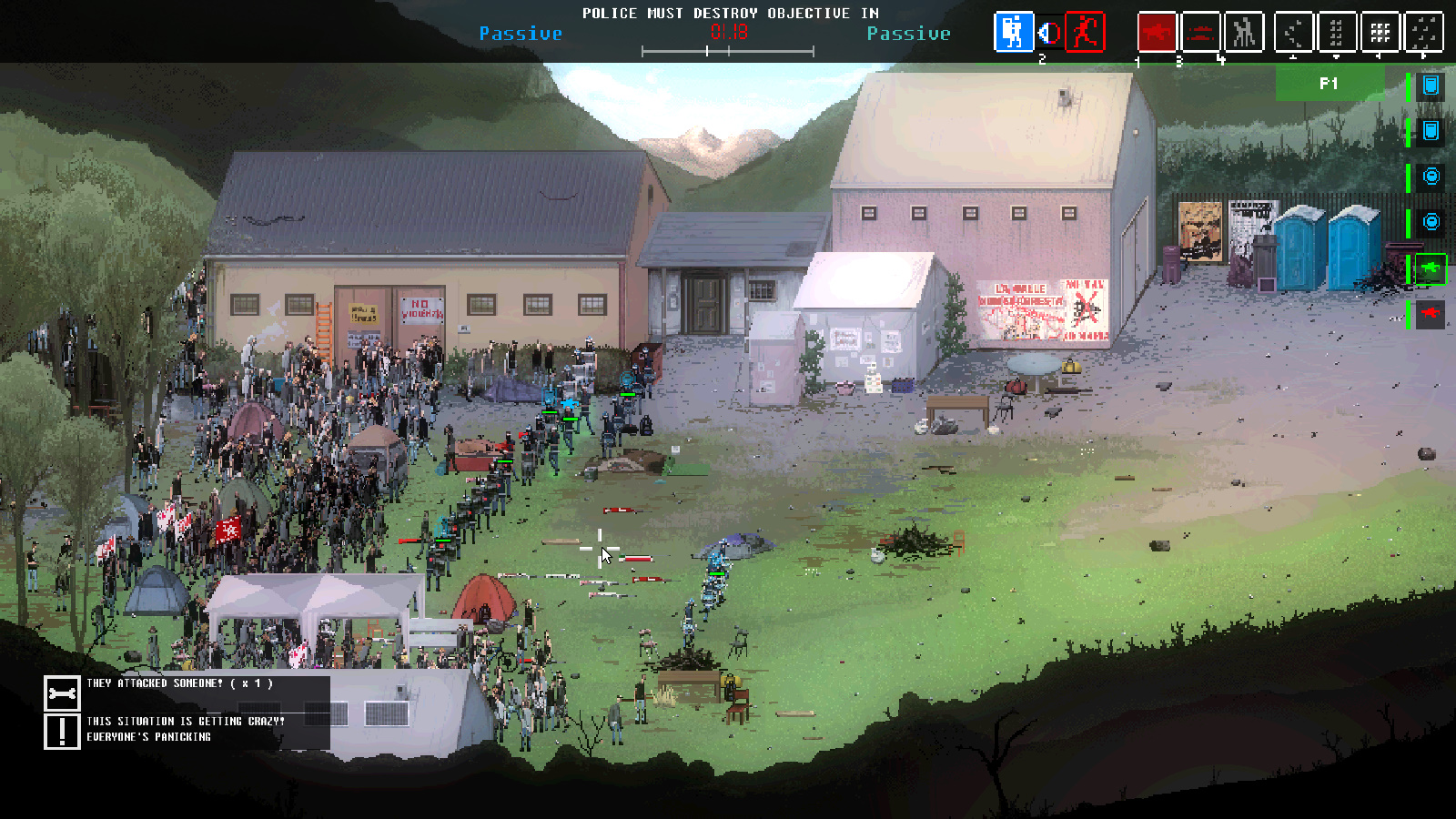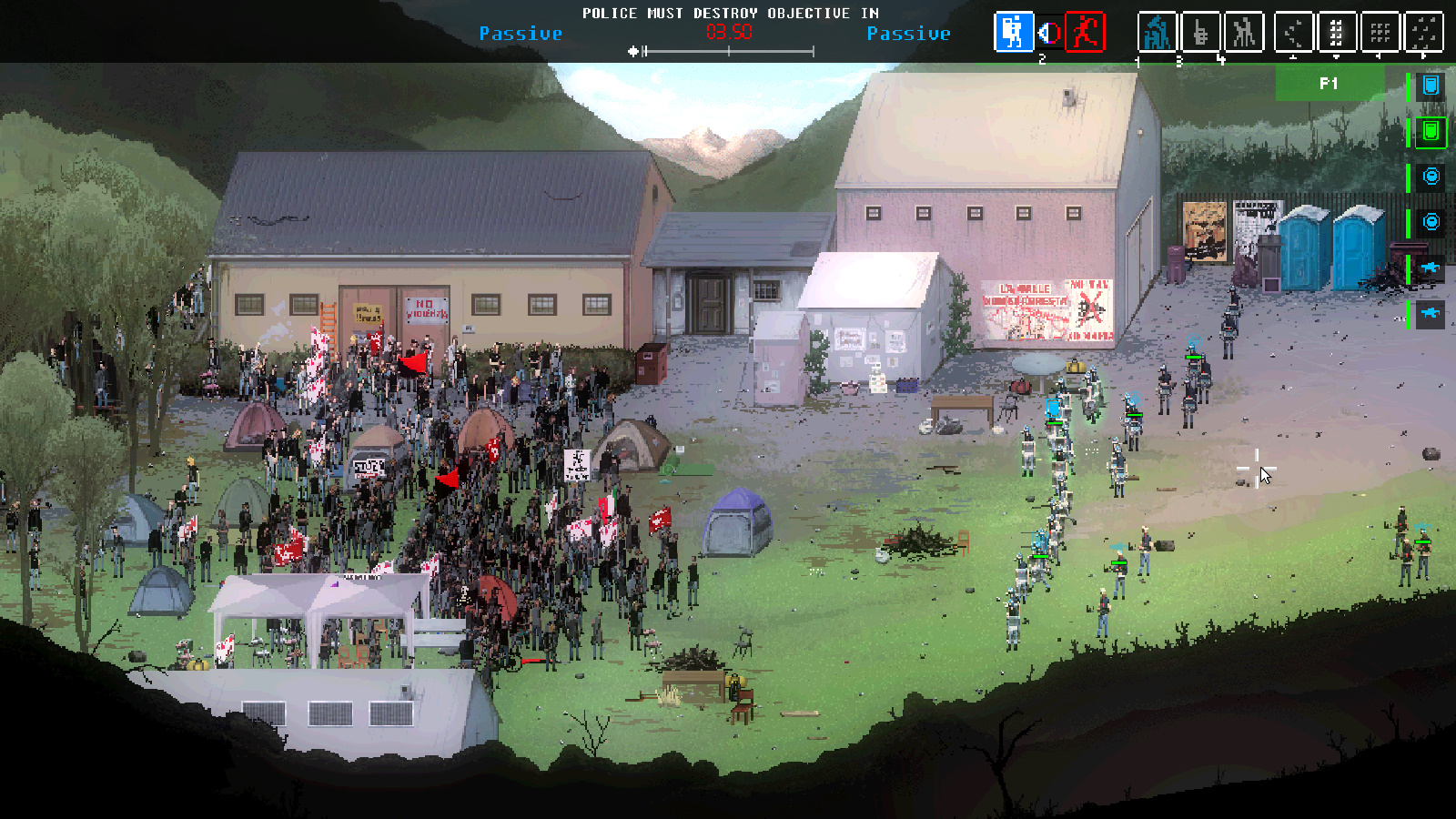 시위대는 통일된 장비와 특성을 가지고 있으며 진압대보다 많은 인원이 특징적입니다.