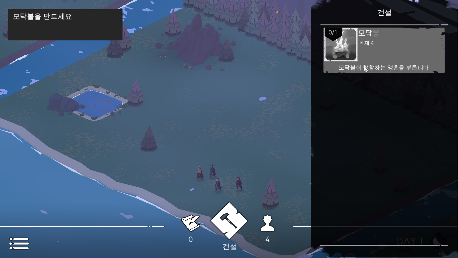 모닥불 건설을 시작으로 점점 마을의 모습을 갖춰나갈 수 있으며,