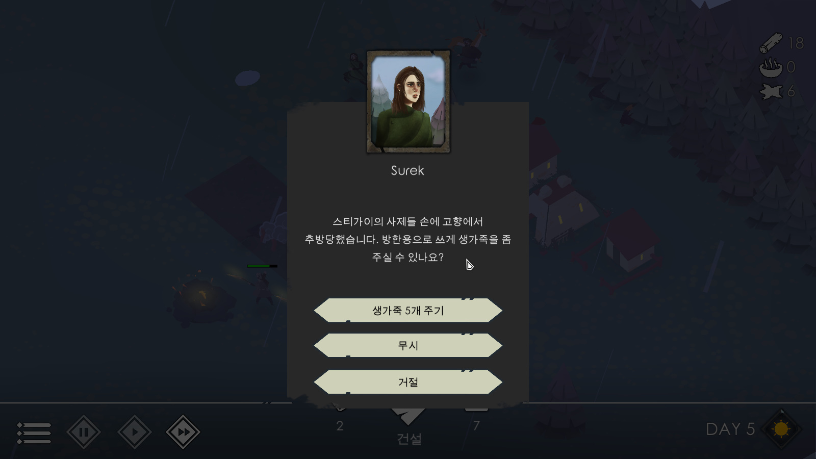 사냥꾼 막사를 건설하여 동물들을 사냥해 식량을 확보하고